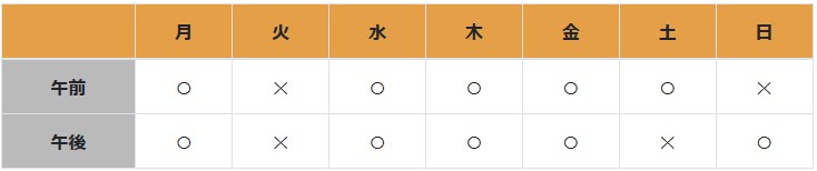 | 午前 | ○ | ✕ | ○ | ○ | ○ | ○ | ✕ |